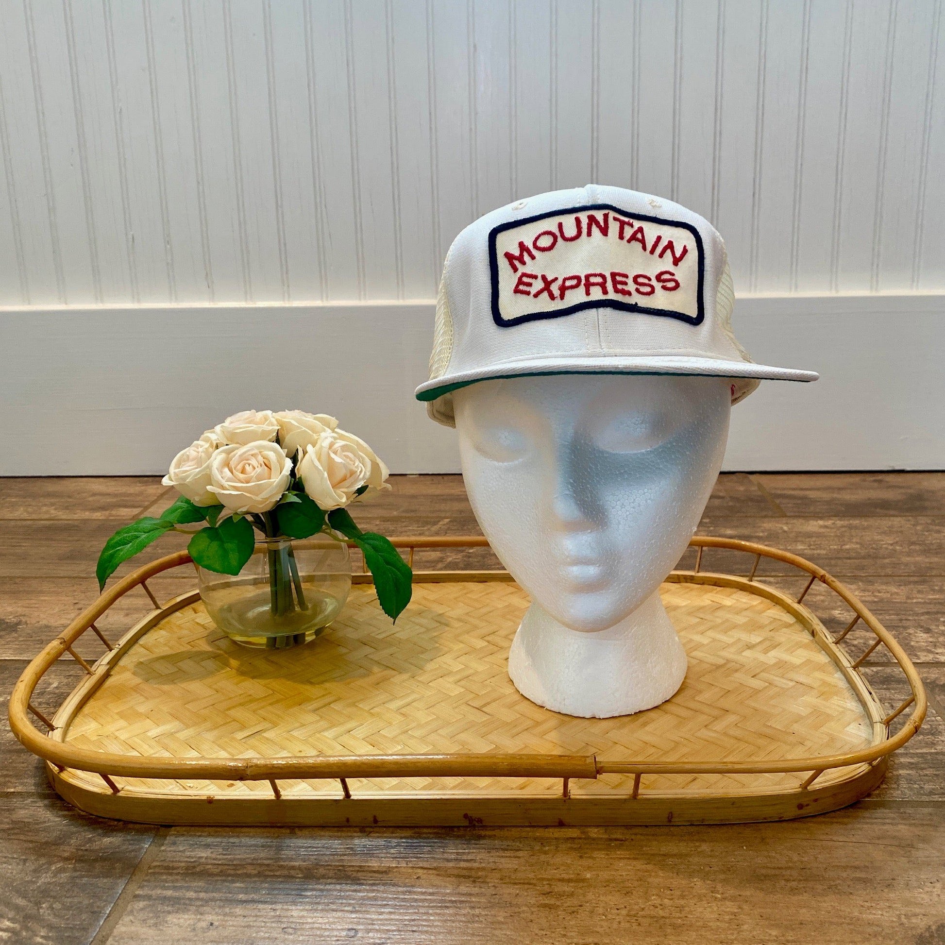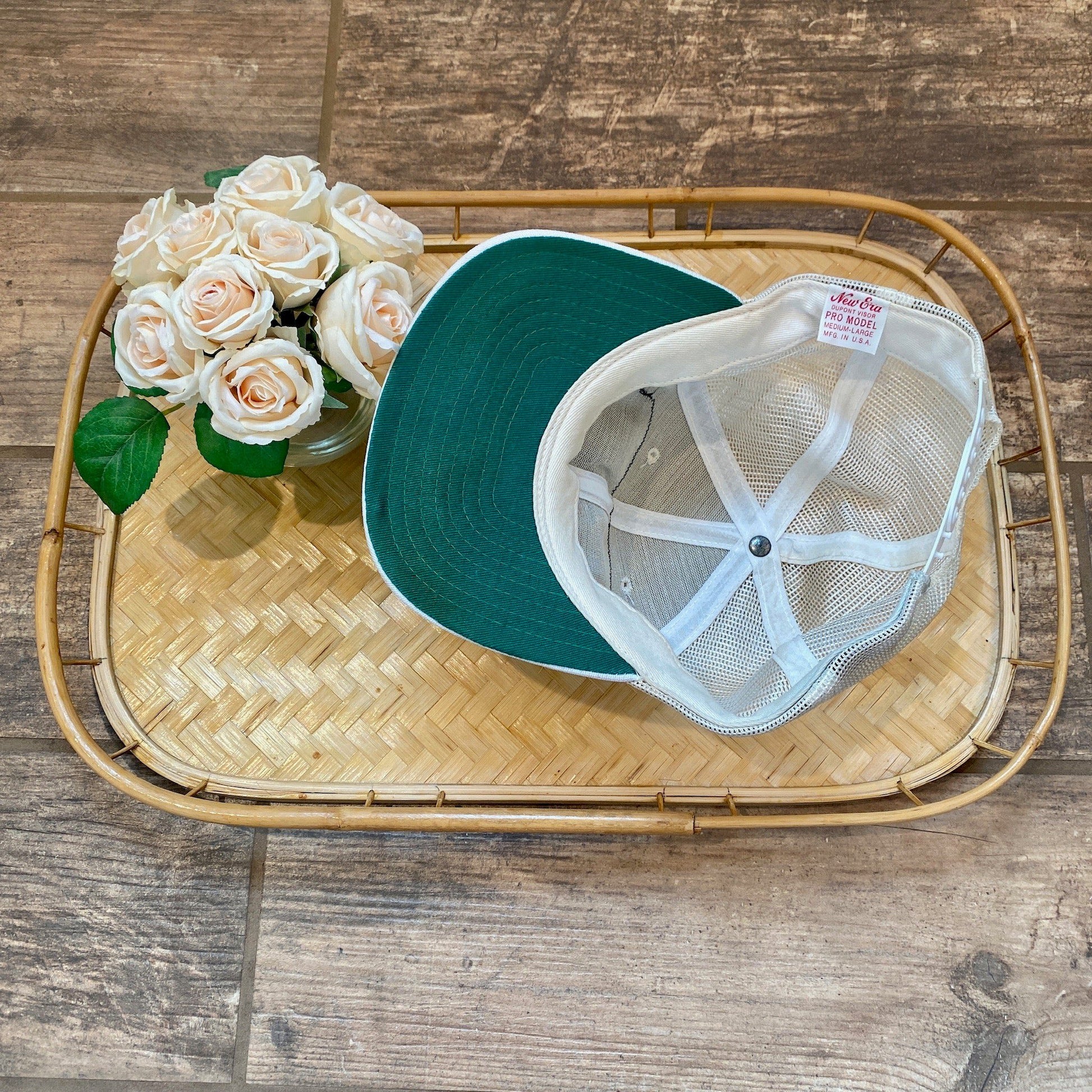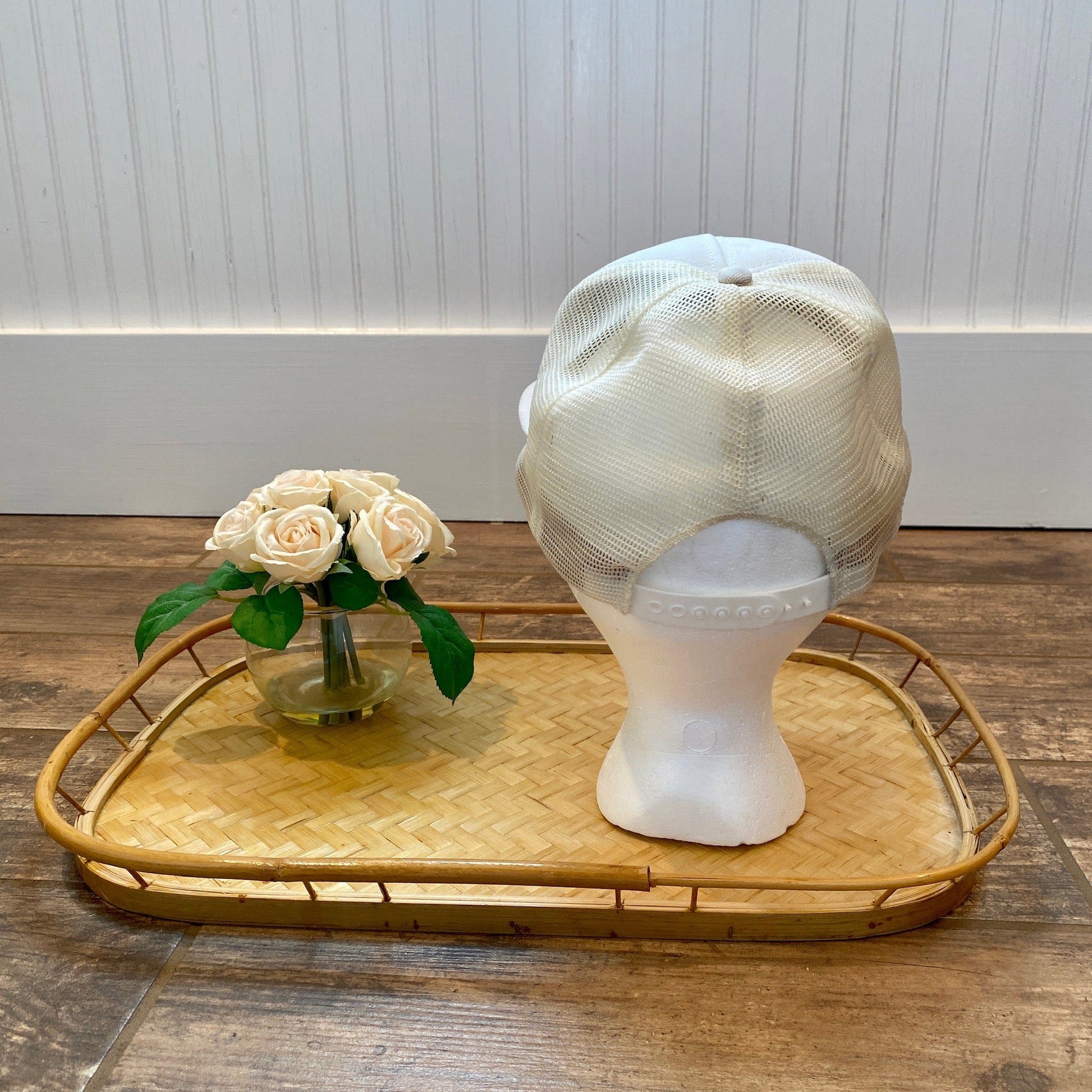 This flat-bill hat is perfectly imperfect. It was once white, but after 50ish years, it's a really great off-white beige with just the right amont of grime. The interior is pretty clean considering how old this is, and it's adjustable strap makes it suitable for many sizes.