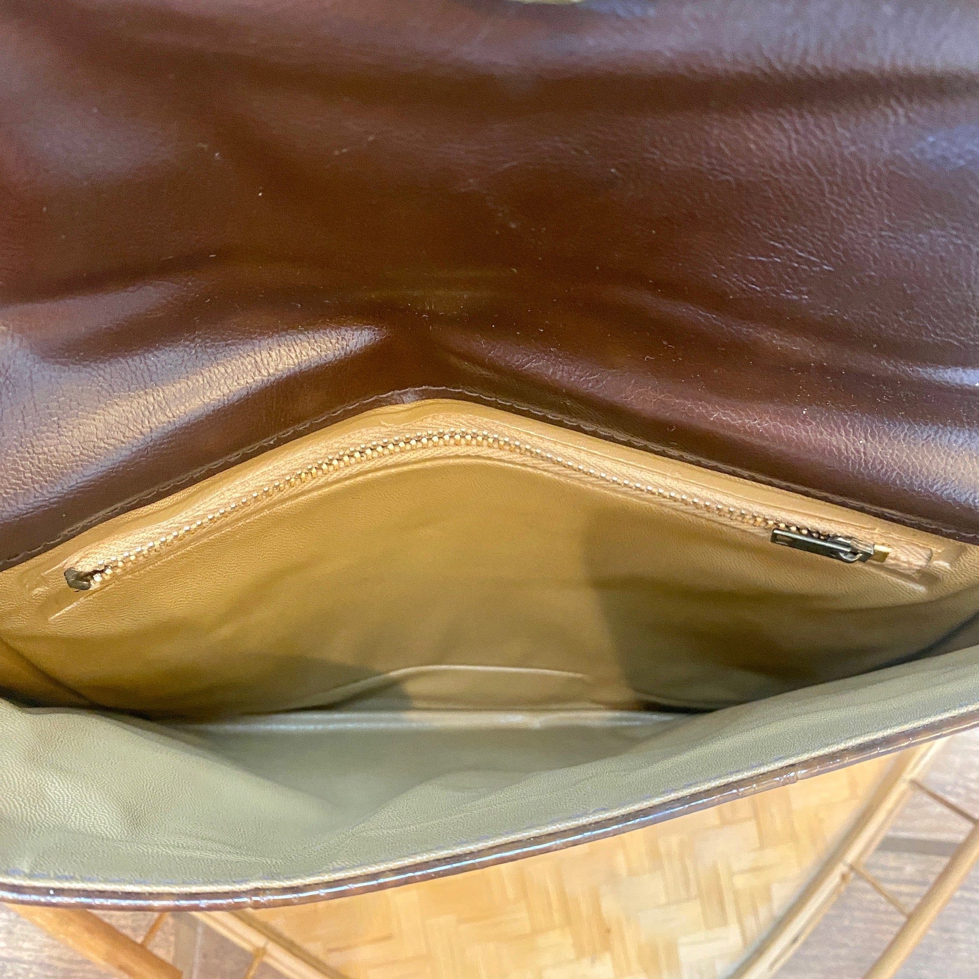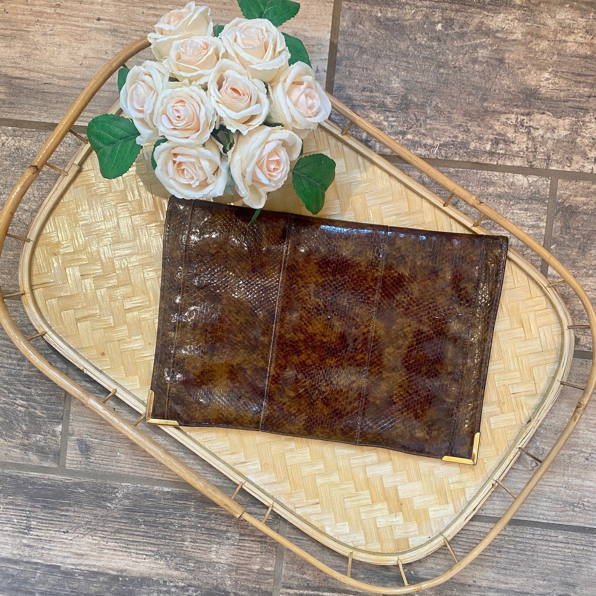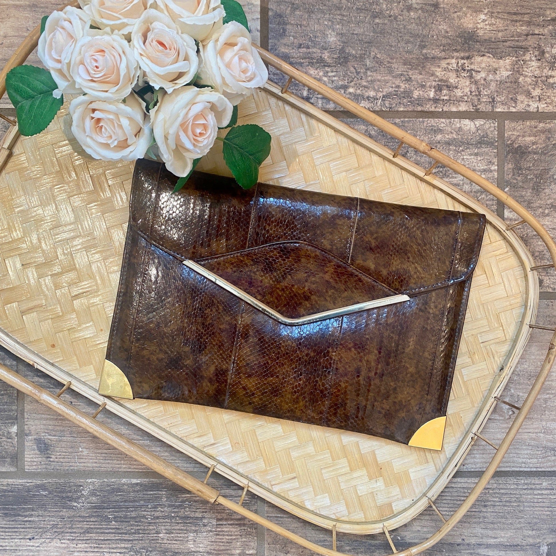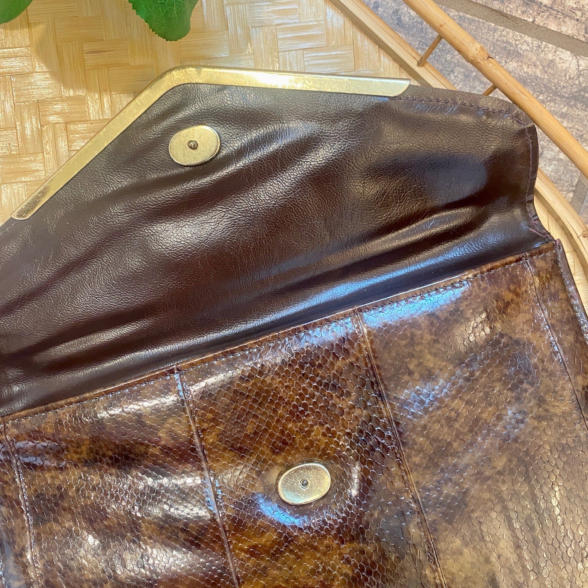 She's an oldie, but a goodie! She made it through the 70's- she deserves a standing O! This brown snake skin clutch is the perfect size, not too small, not too large- but will definitley hold all of your important things! She has gold tone hardware, and that hardware is the only place she shows her age. There is some gold missing along the flap closure, and the corner pieces have light markings on them as well.