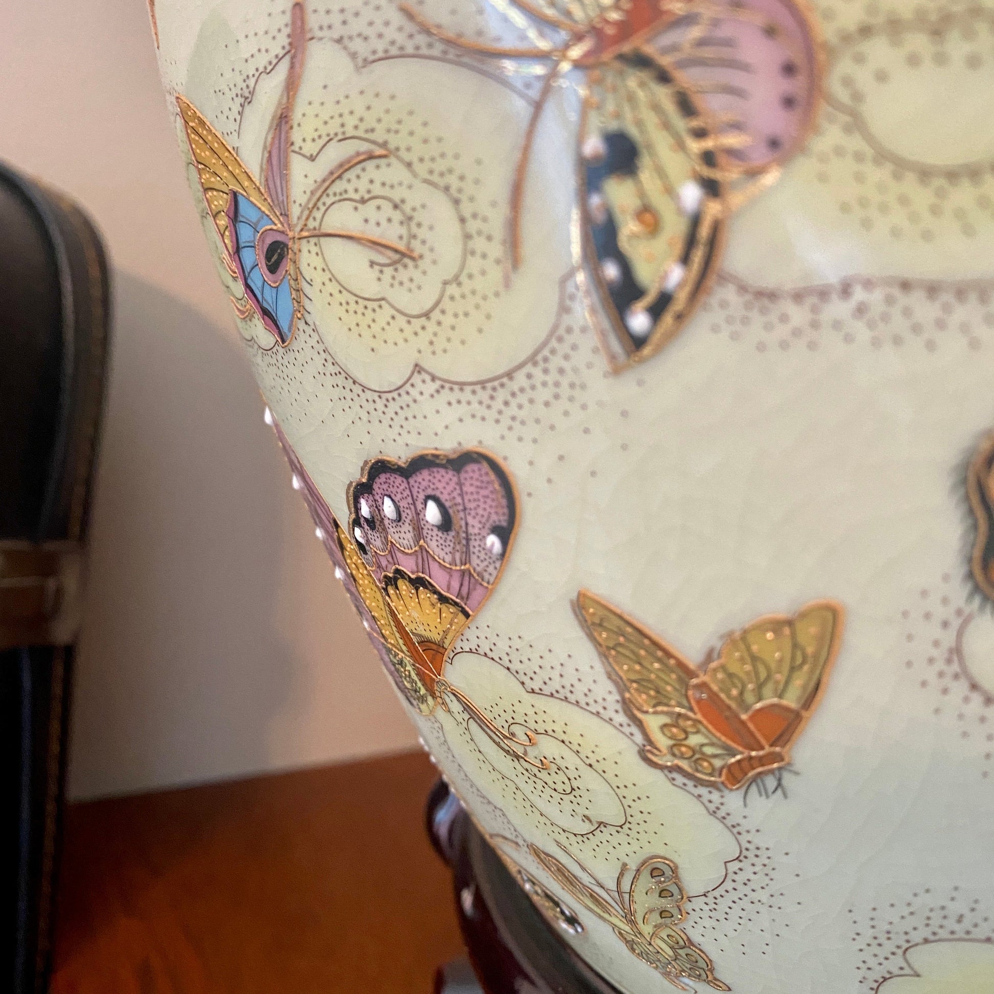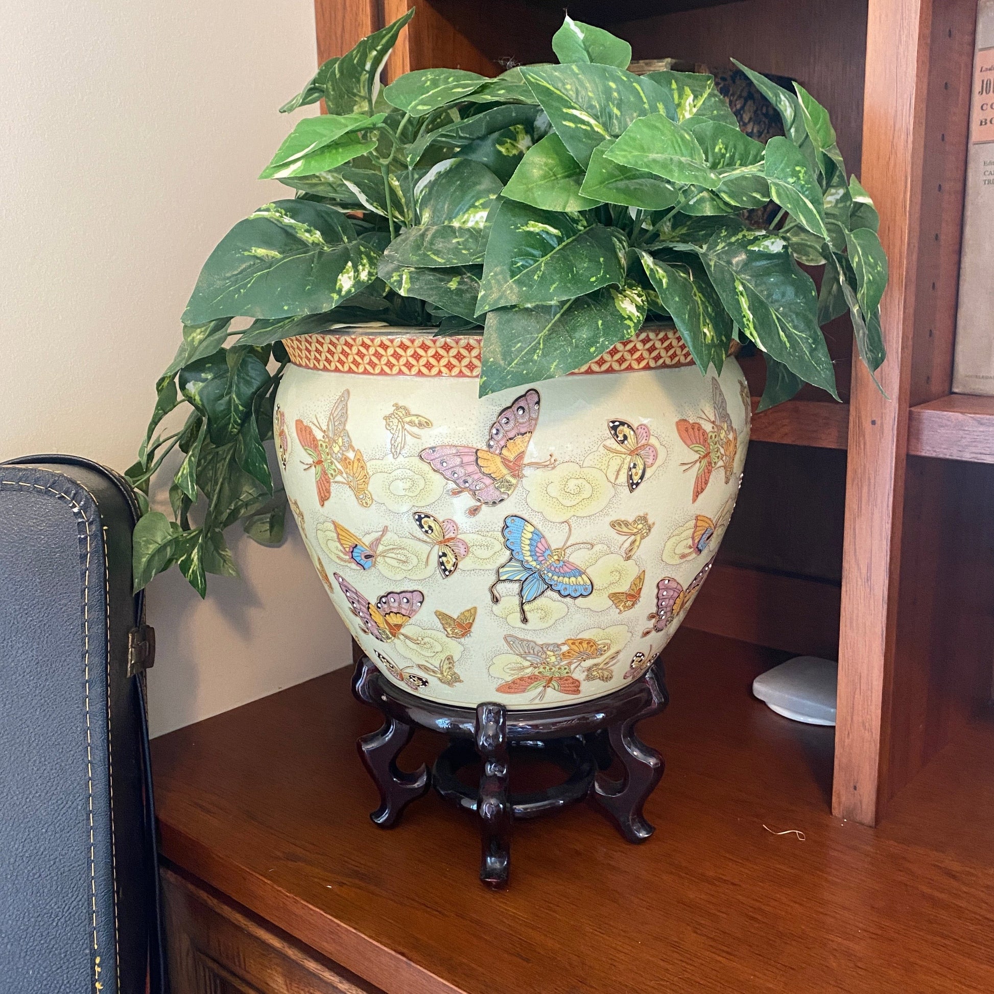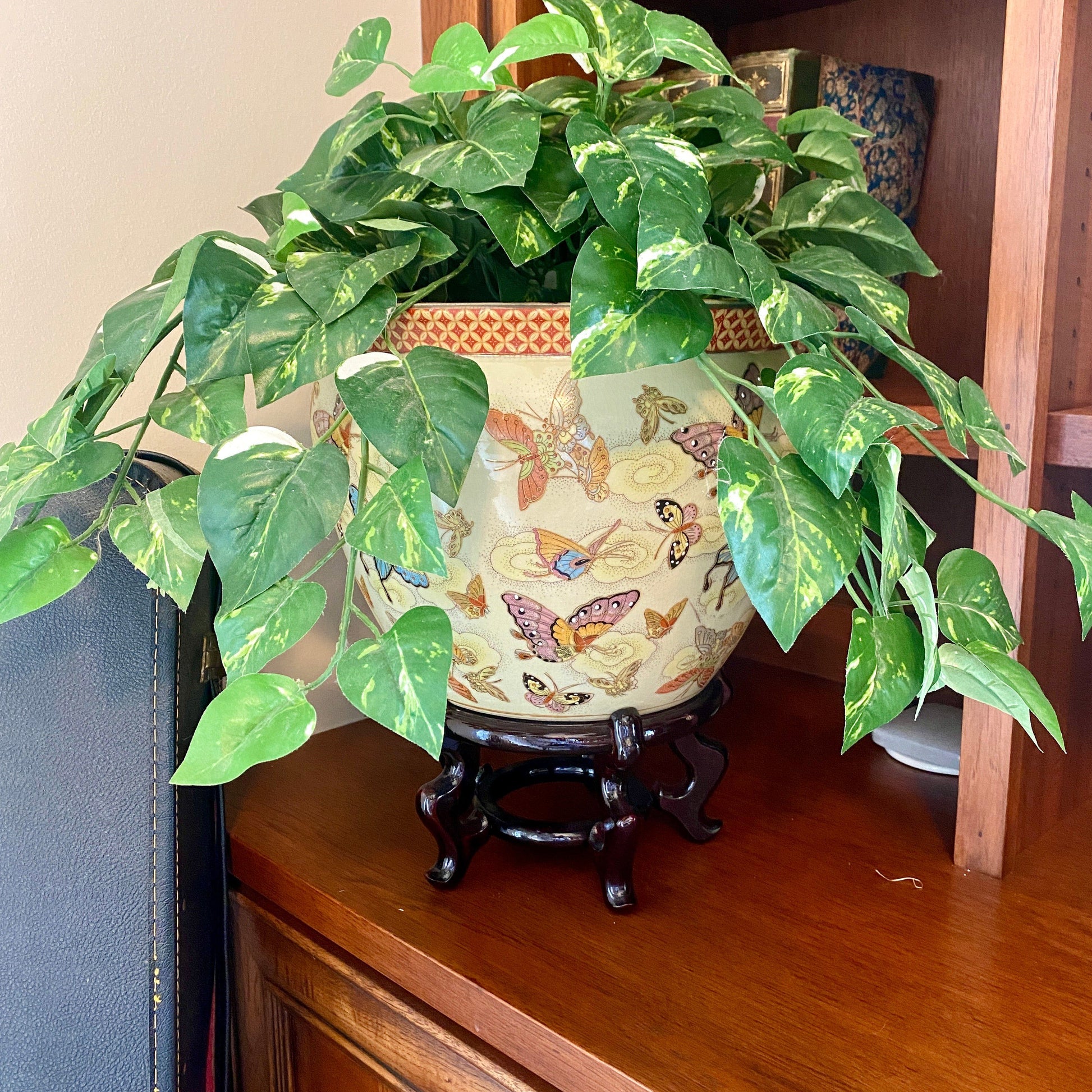 If you're a collector of plant babies the way we are- you're ALWAYS on the hunt for exceptional plant pots, and let me tell you this one is a stunner! She has uniforms crackling, but it in no way takes away from the myriad of hand painted butterflies. (She also has raised painted details, see close up photo)
