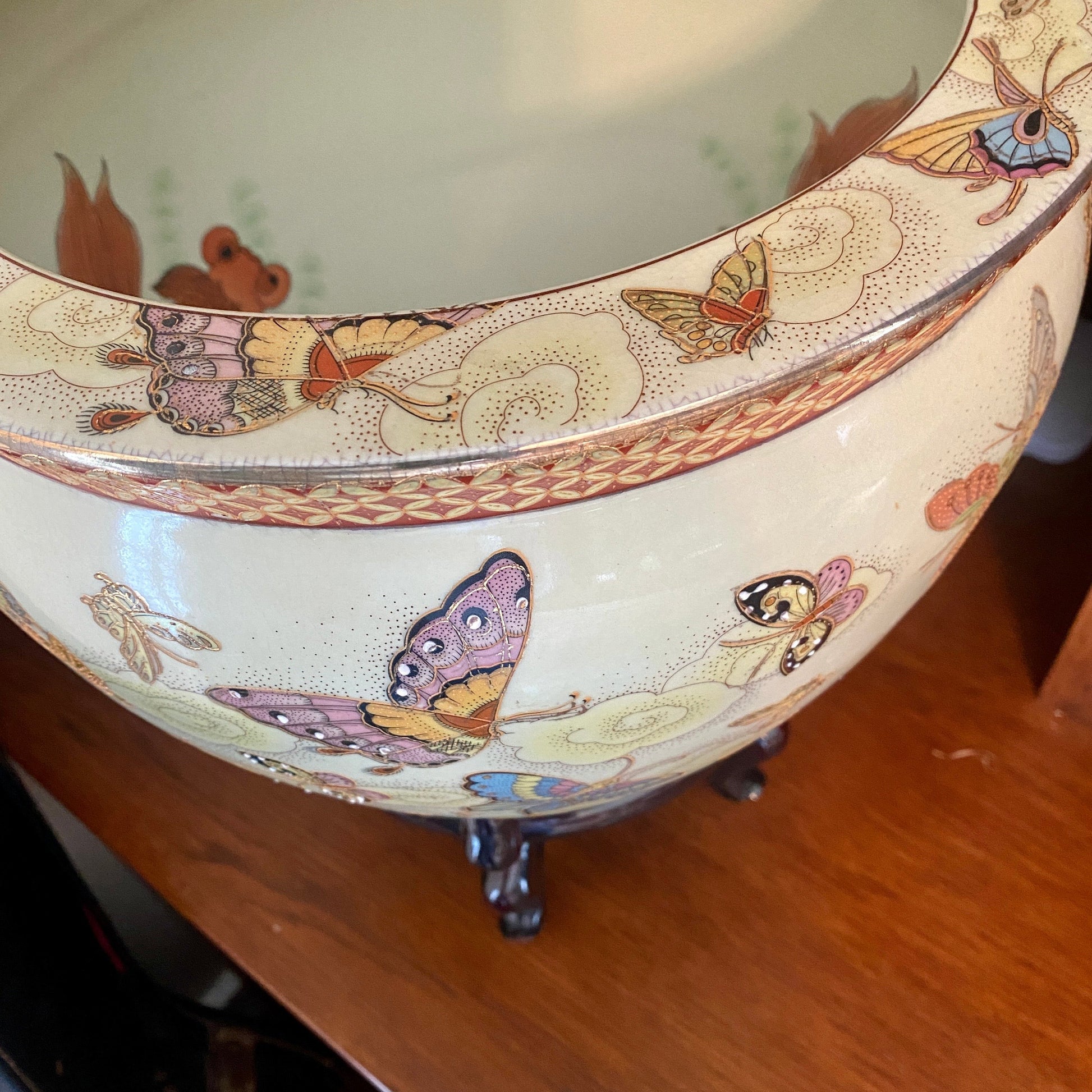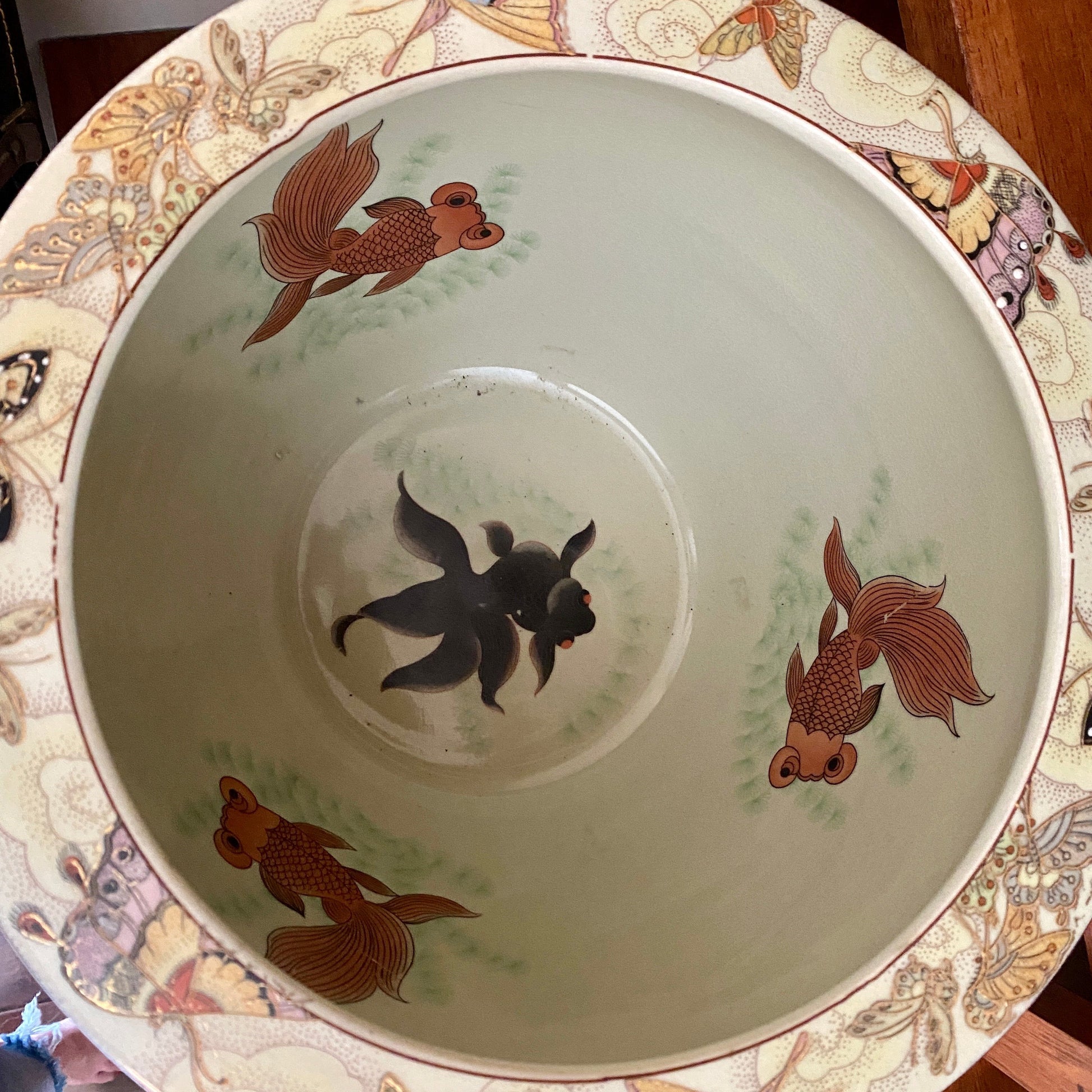 When you look inside- this pot features hand painted Koi fish... we love the details on this piece! It does come with it's solid mahogany wood base as well.