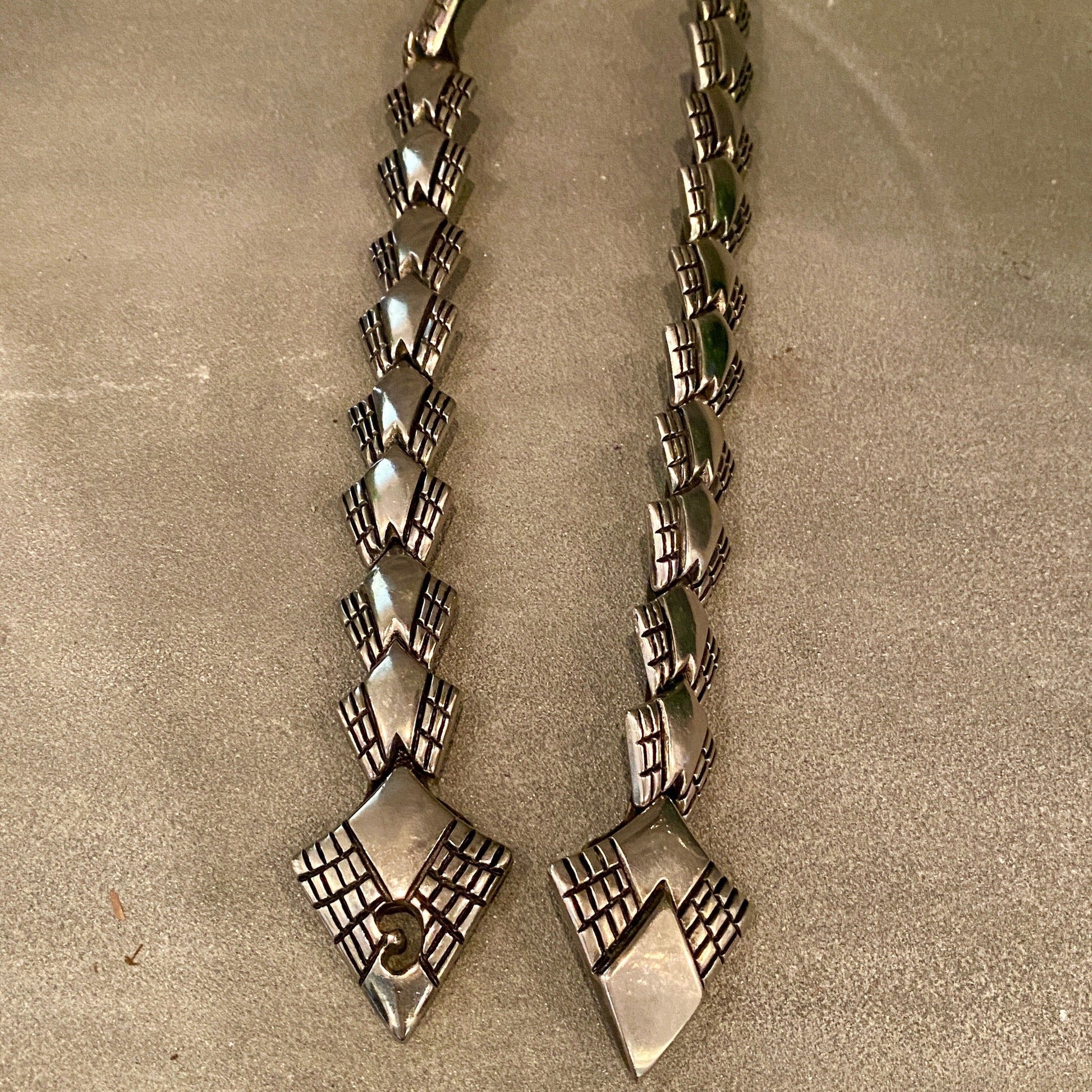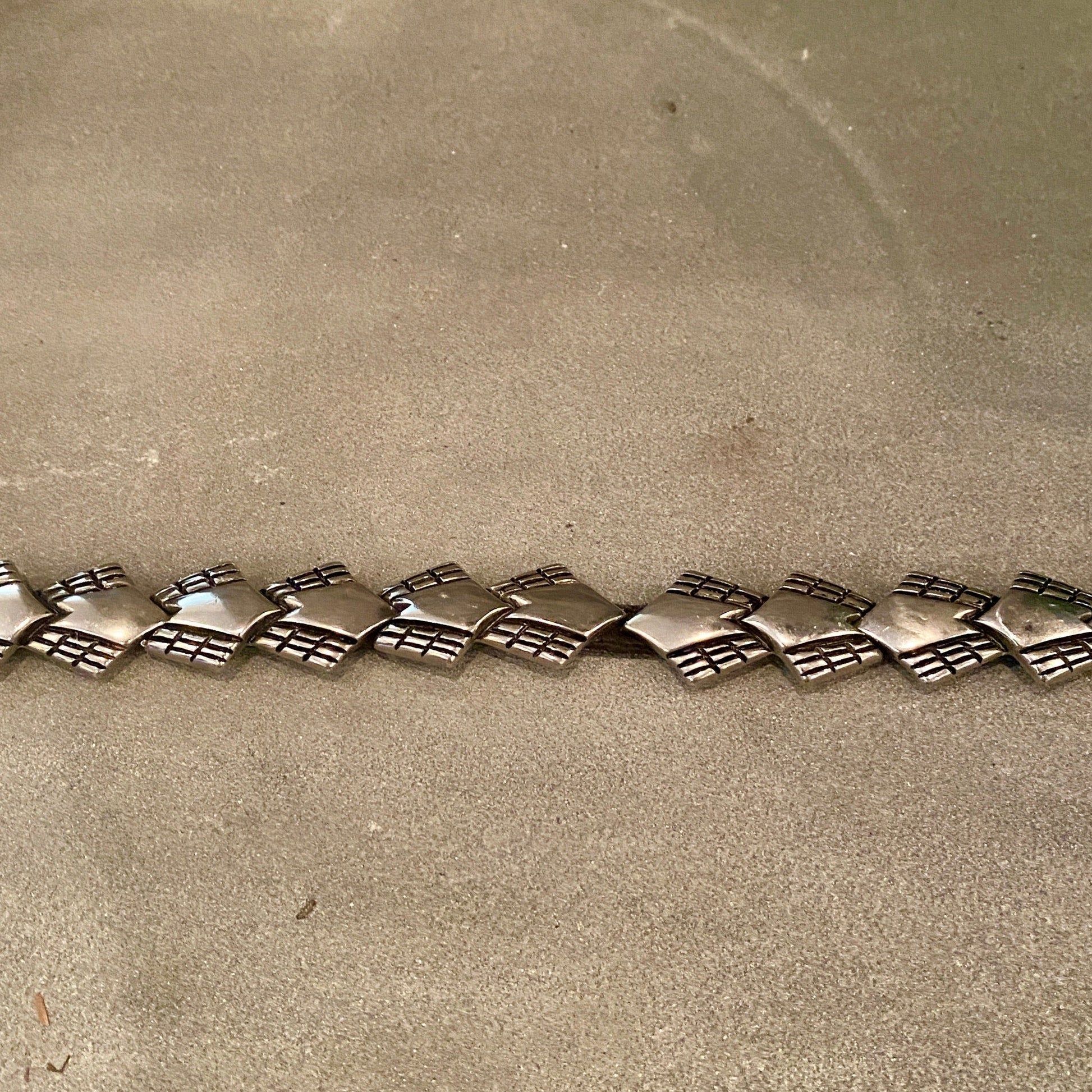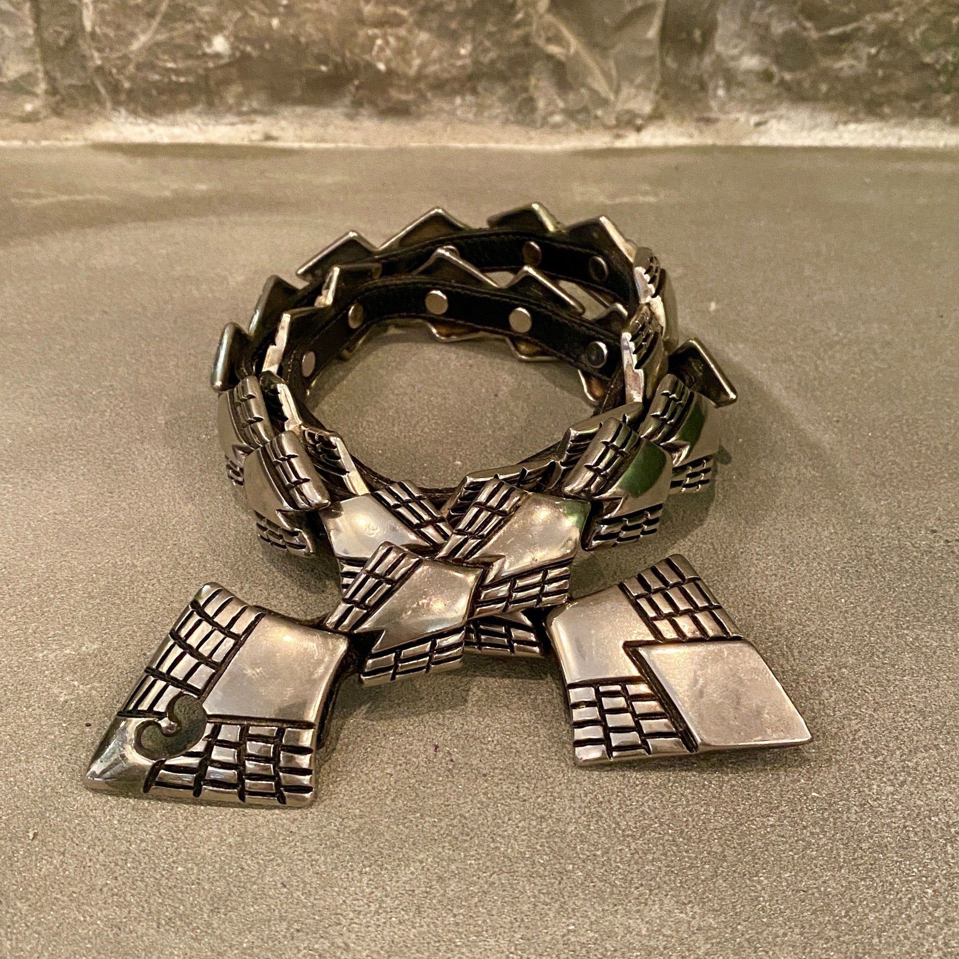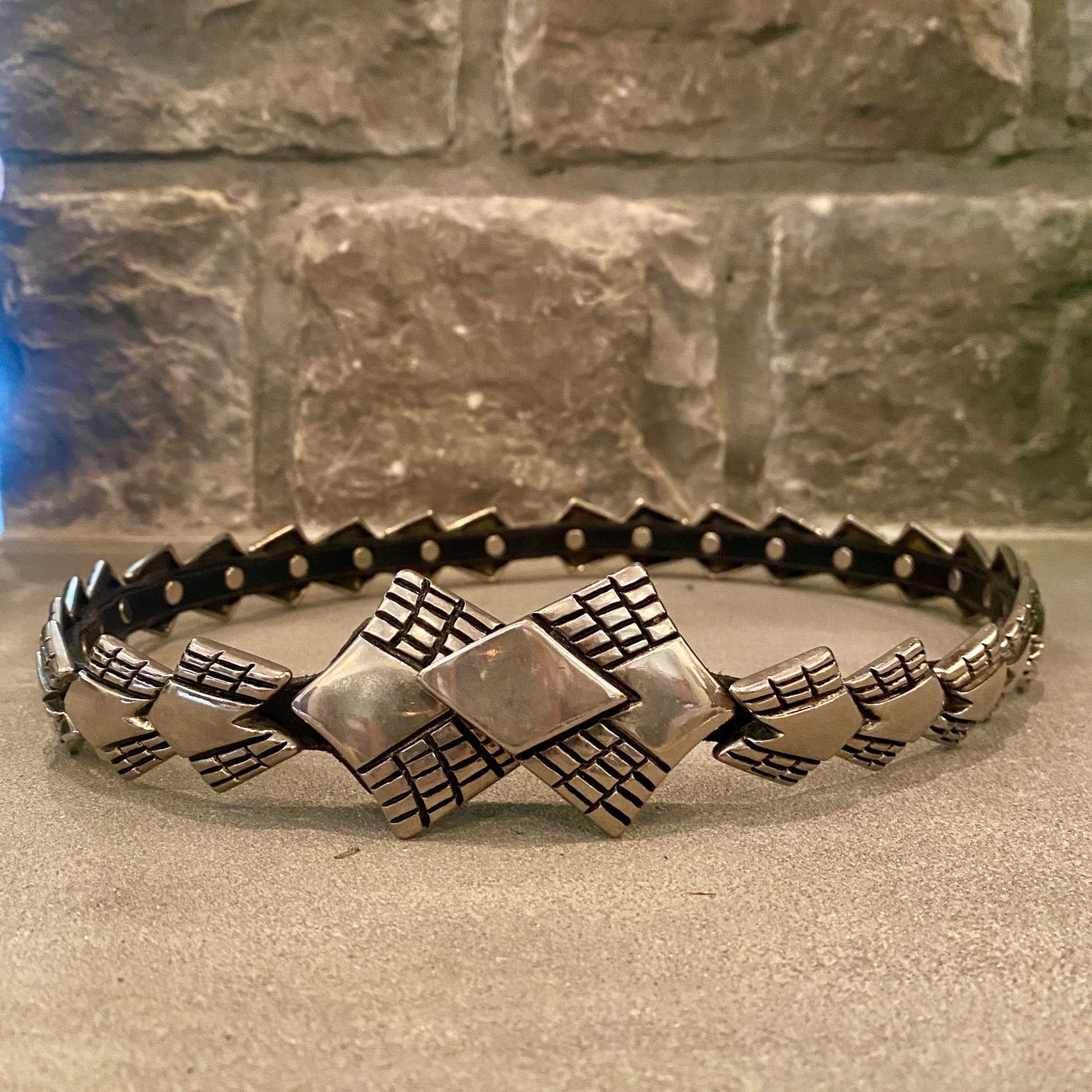 We love this belt so much- it's almost hard to let it go! It's a black leather belt, with individual metal "scales" that wrap around it- and a hook closure at the end. It's HEAVY, and incredibly made... this one is still a stunner even after all these years. She's in no way adjustable unfortunatley- so if you're looking for a 30" belt, this one is for you!