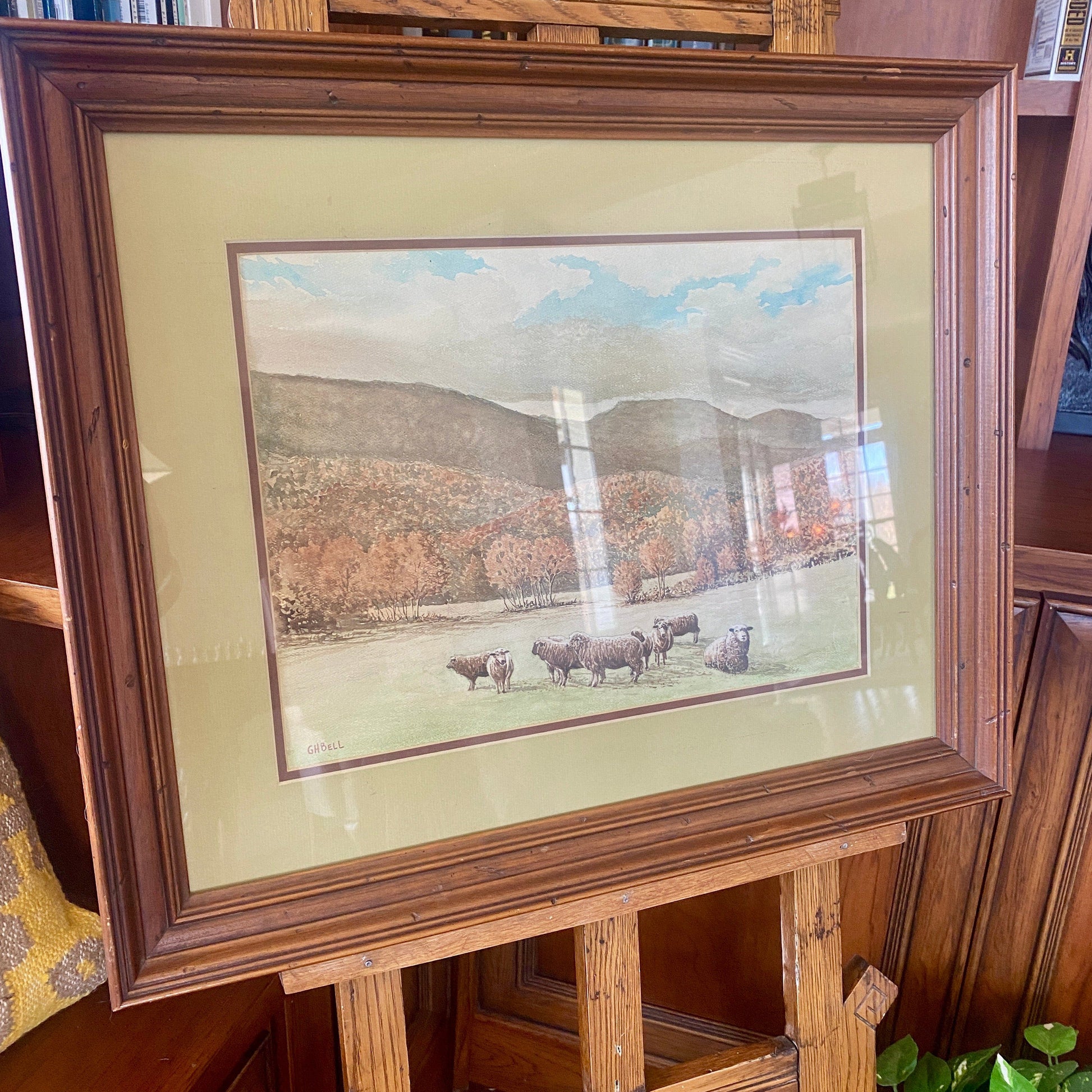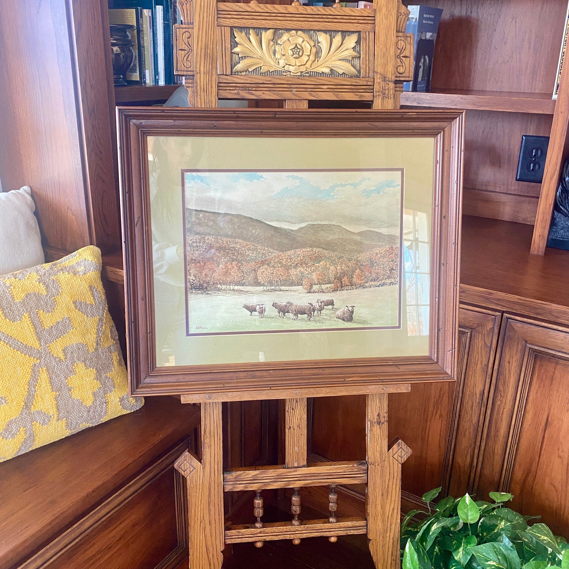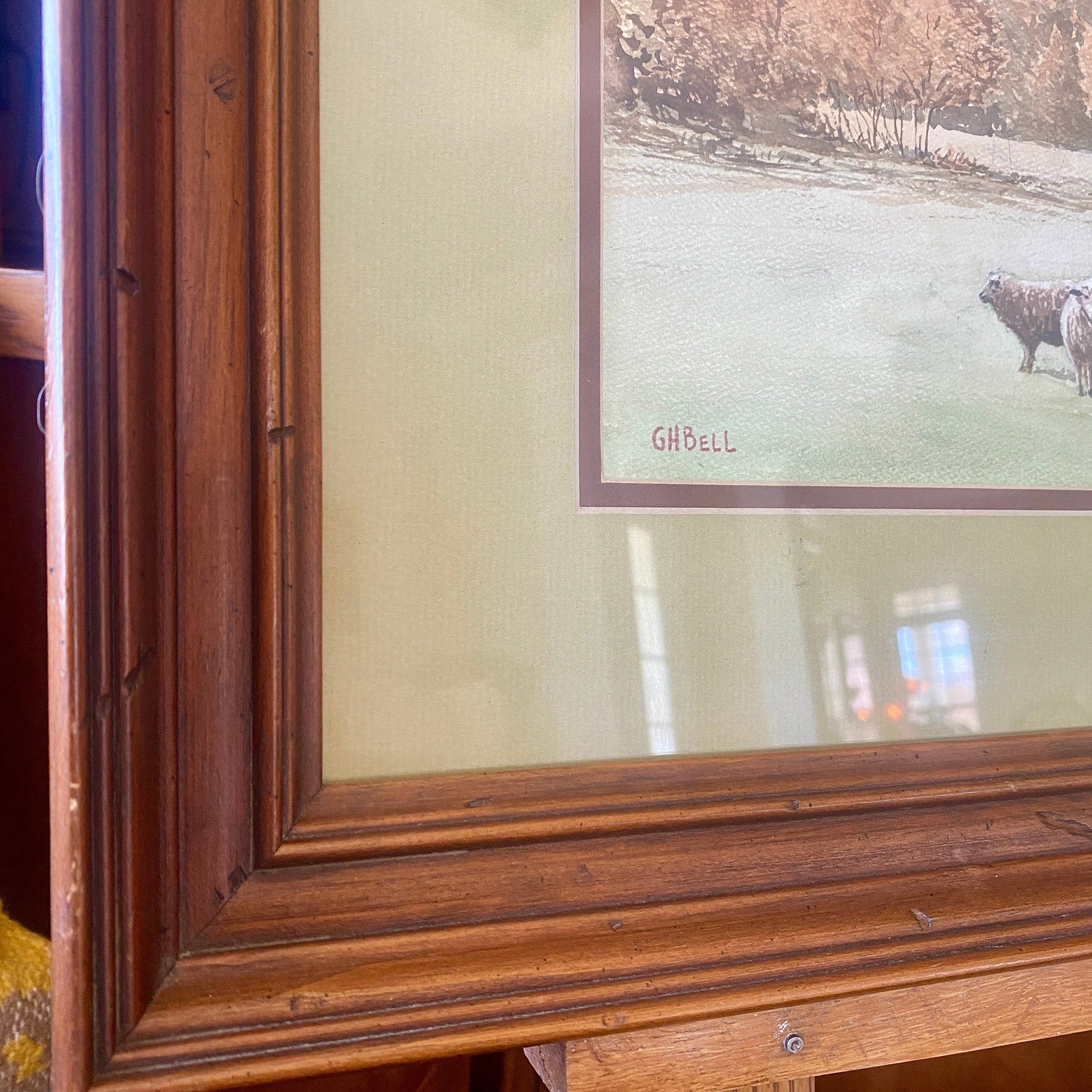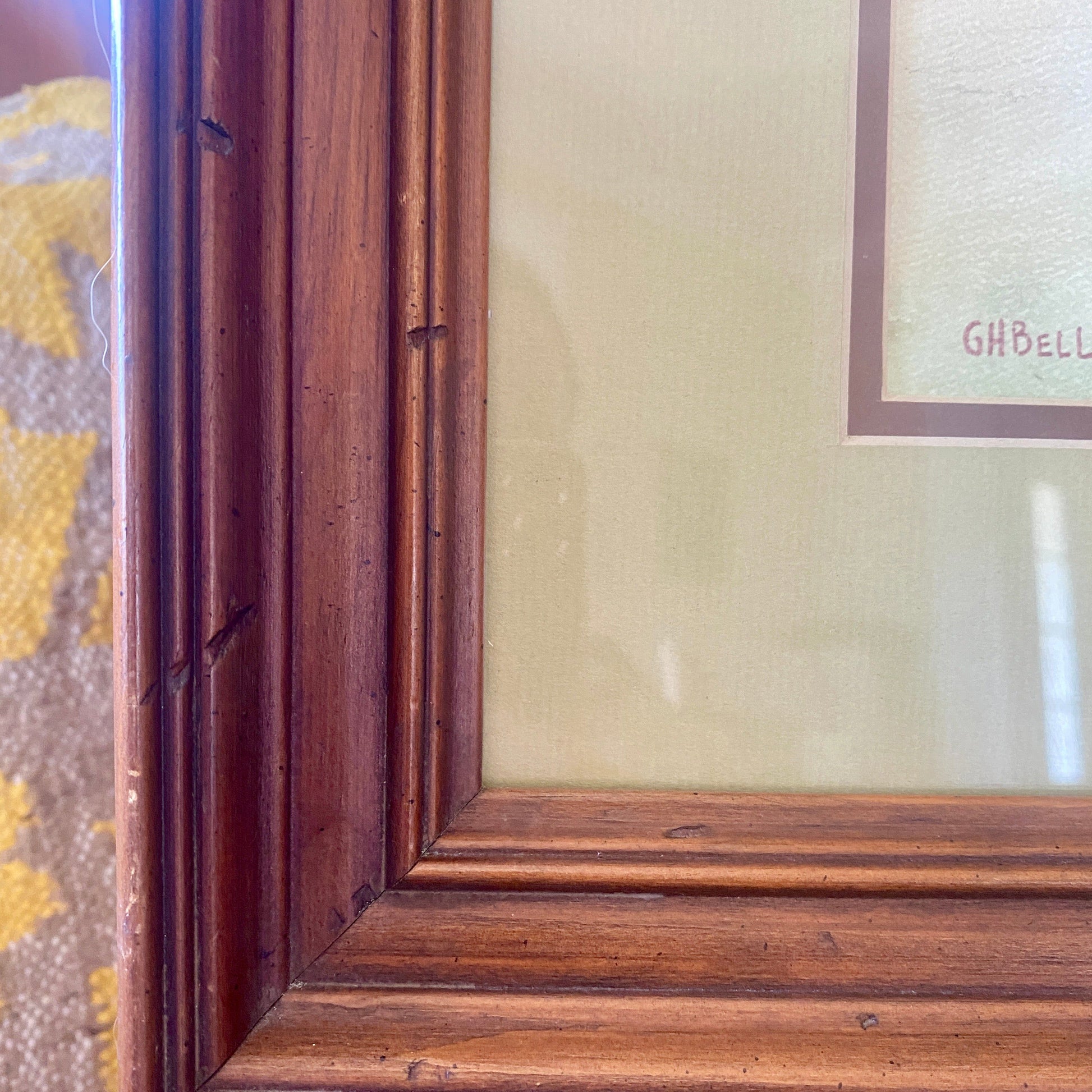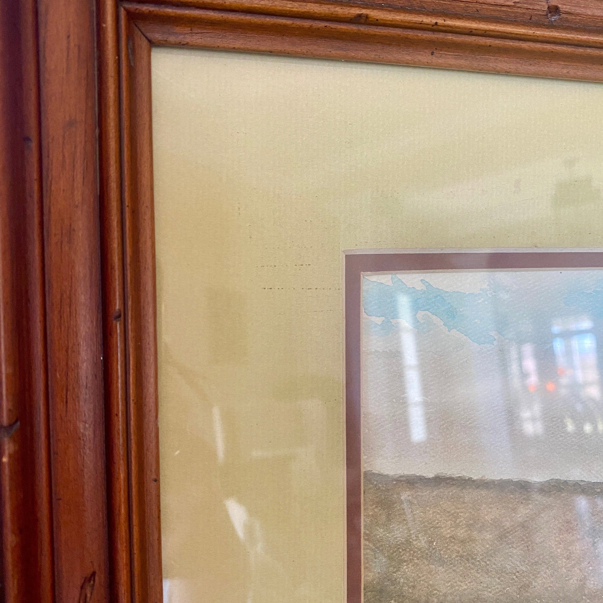 This original water color is double matted green and brown, with a stained oak frame. It also has a glass face. There is a small mark on the matting in the upper left hand corner of the piece, there is a close up photo.
