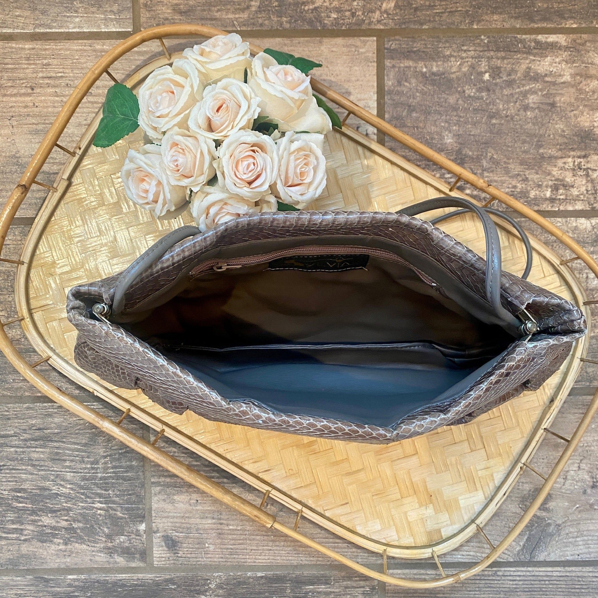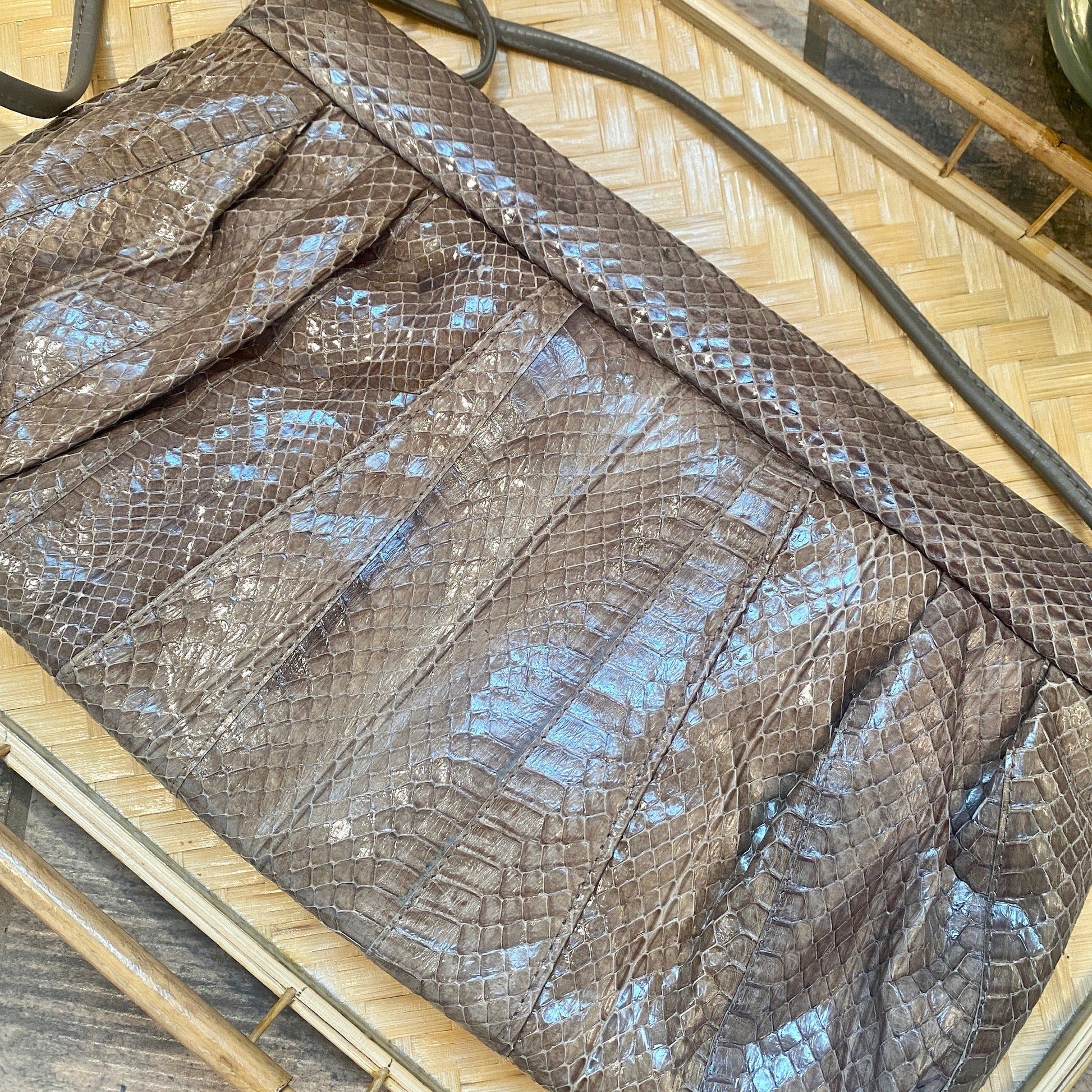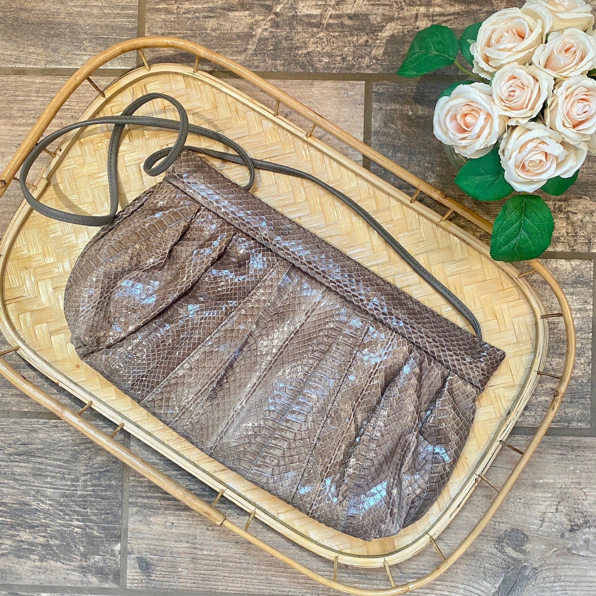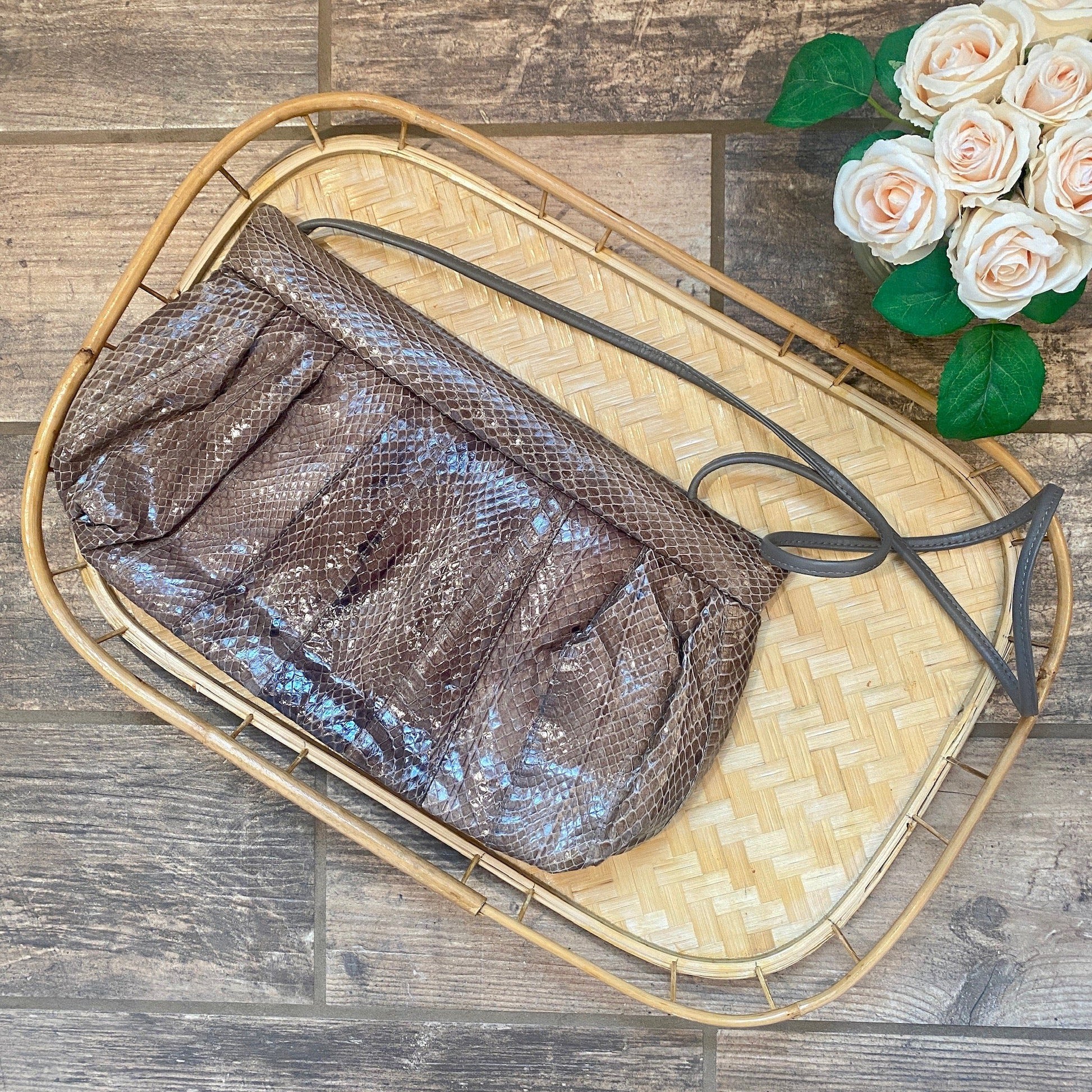 This is the COLOR of the spring- this light mocha snake skin clutch is everything! It's got a hinge opening so it's really easy to grab your lip gloss in a flash! It also has a leather strap, so you can put it on your shoulder while you're dancing the night away! She's in excellent condition with virtually no wear on the outside.