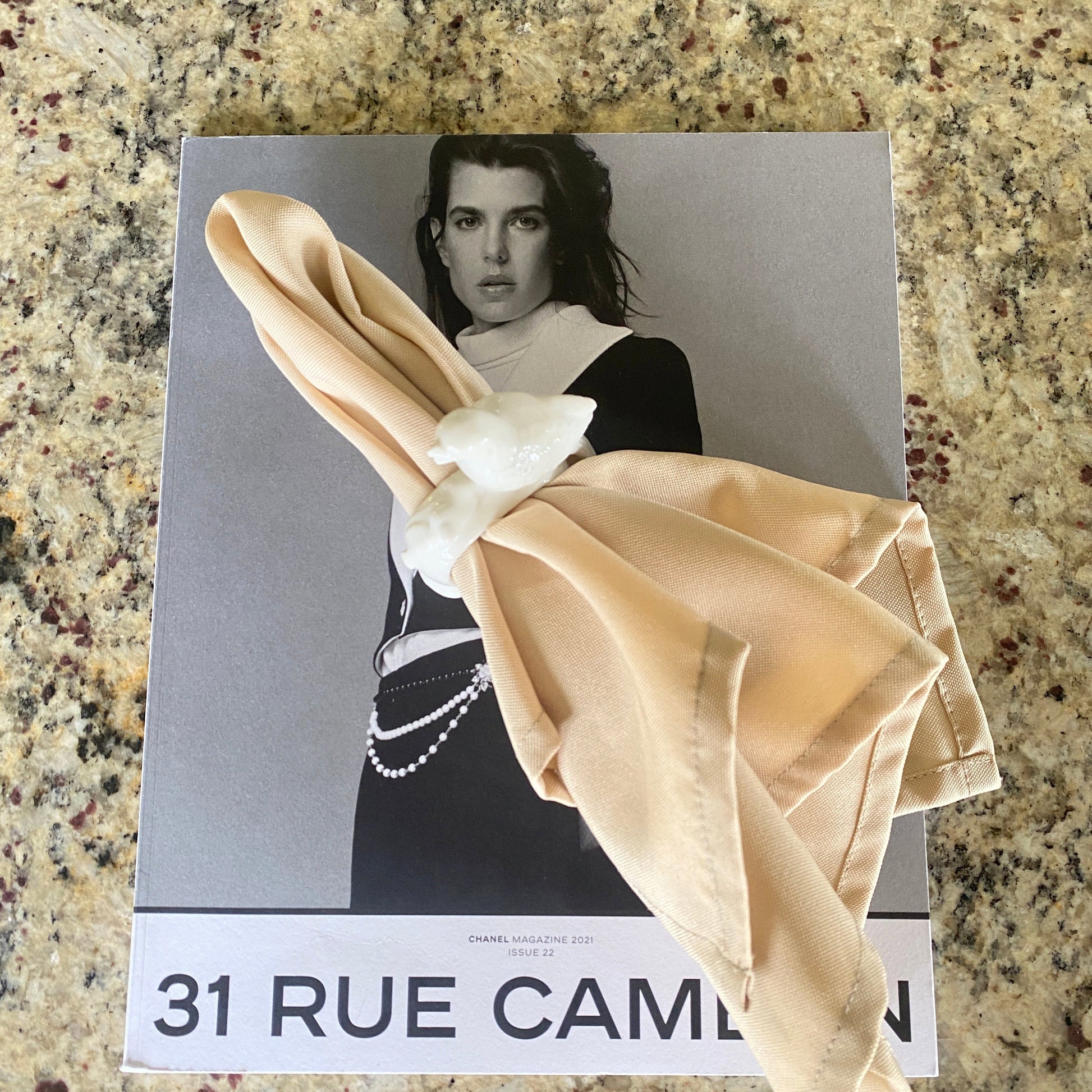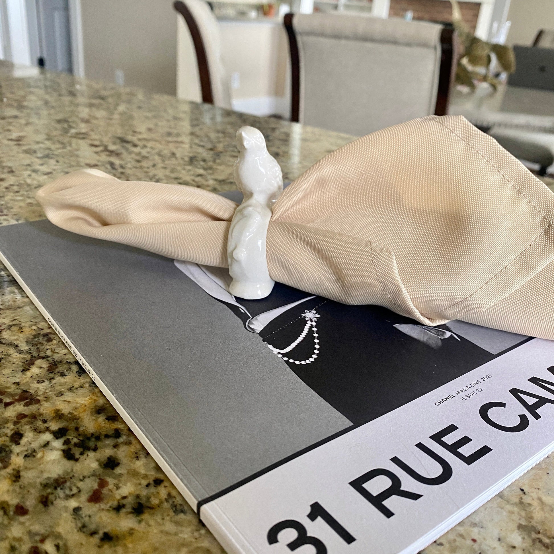 Each of the eight white porcelain napkin rings measures approximately 2.75 in in height. They sit on a flat bottom base measuring at 2.5 in in length. The oval hole the napkin sets in measures 1.75 inch by 1 inch. I love that they are flat-bottomed. It keeps your guests from chasing down their napkins.