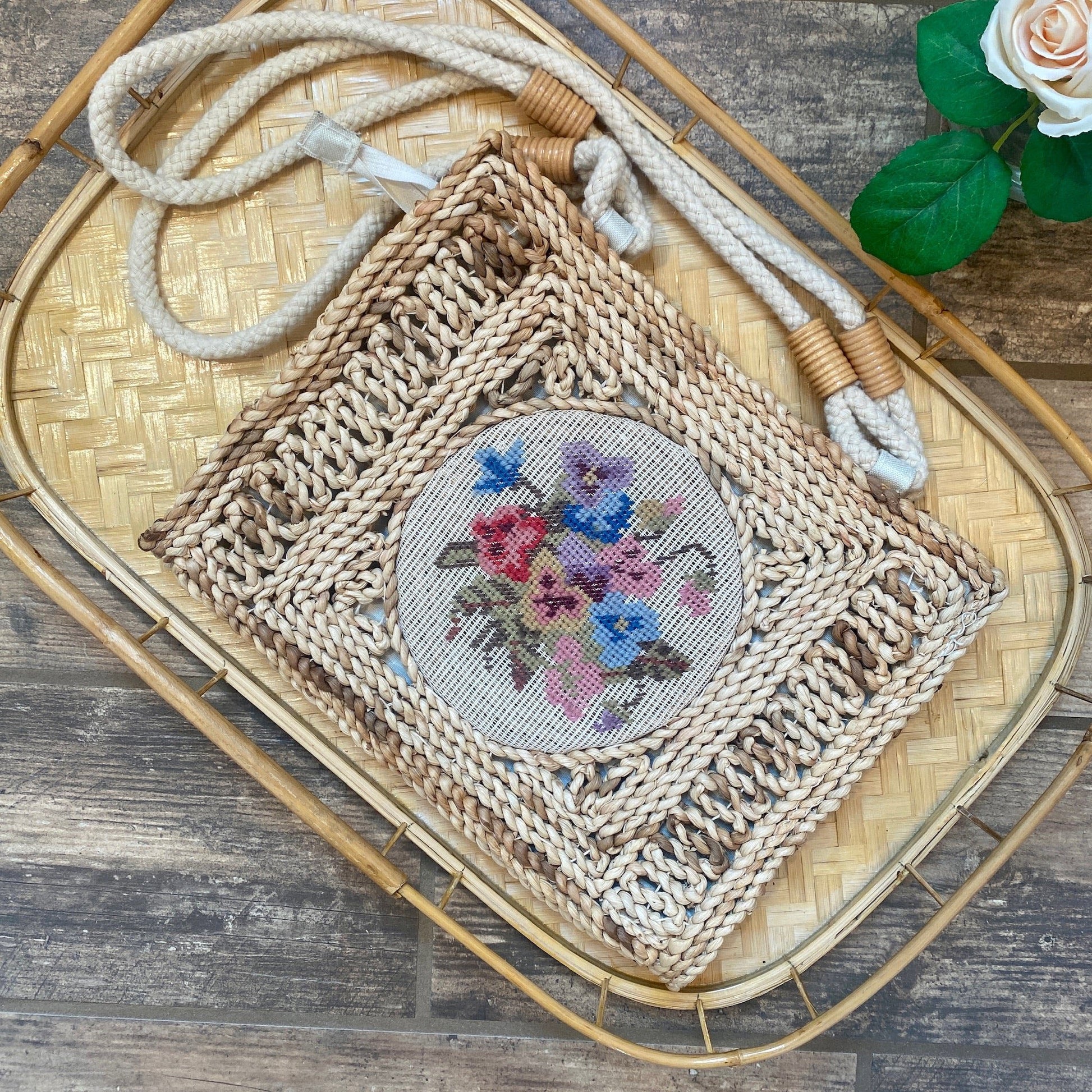 Take us to Palm Beach with this bag! It's super cute, and perfect for summer. It has needle point patches on the front and the back, and honestly the one on the back looks like it was sewn off center when this was made- but its only obvious if you really study it. The rattan is in great shape without any pulls or rips- and has a zipper closure with a soft rope handle.