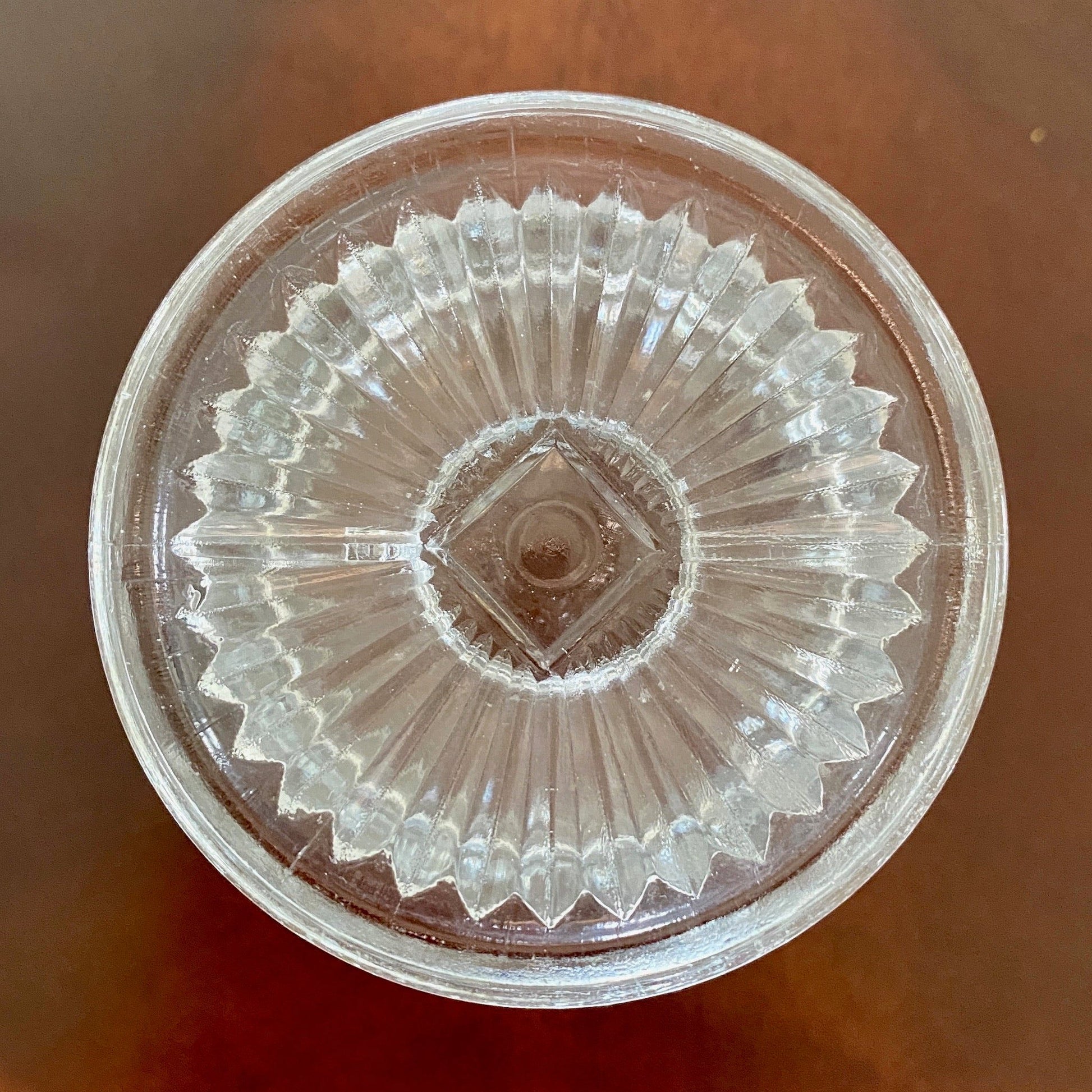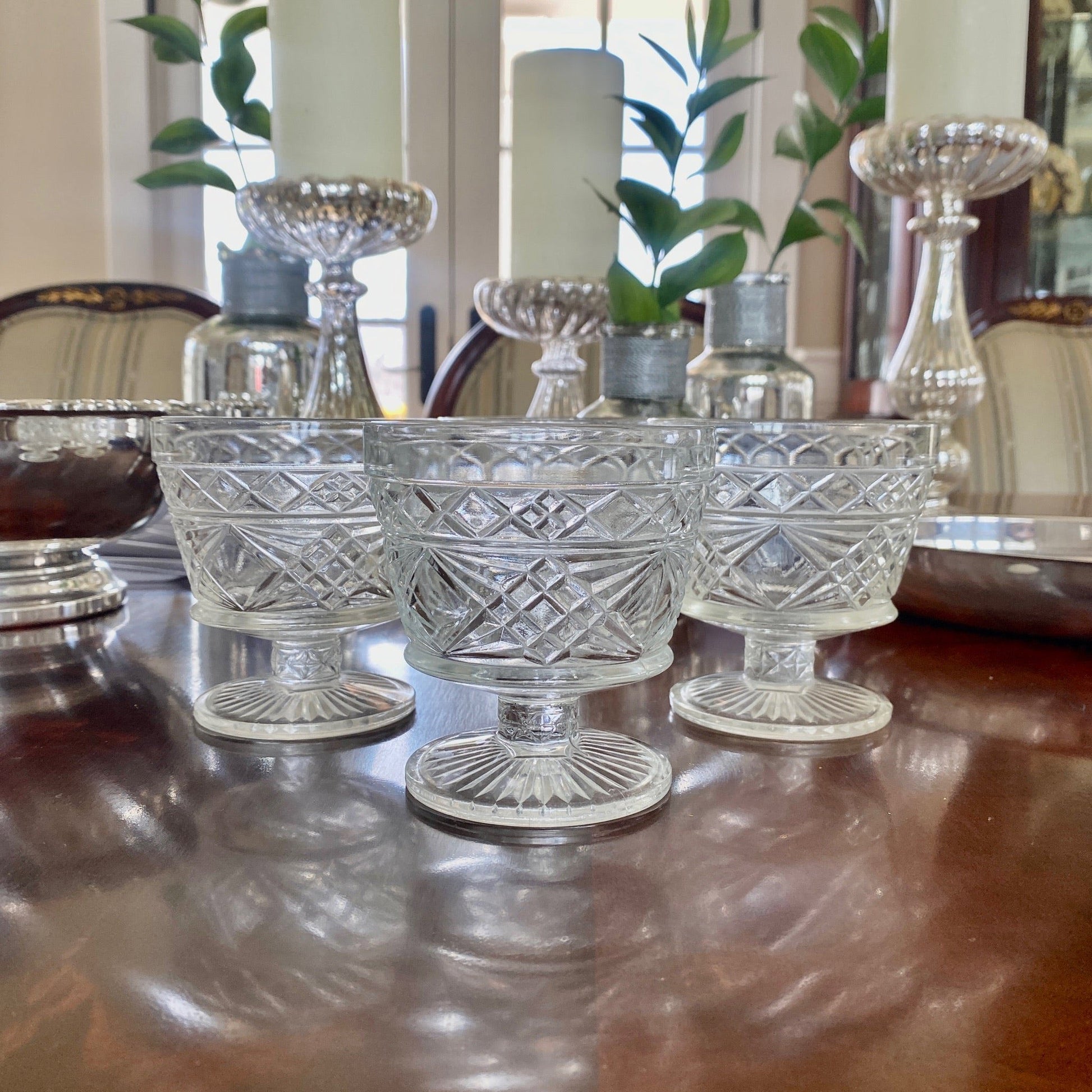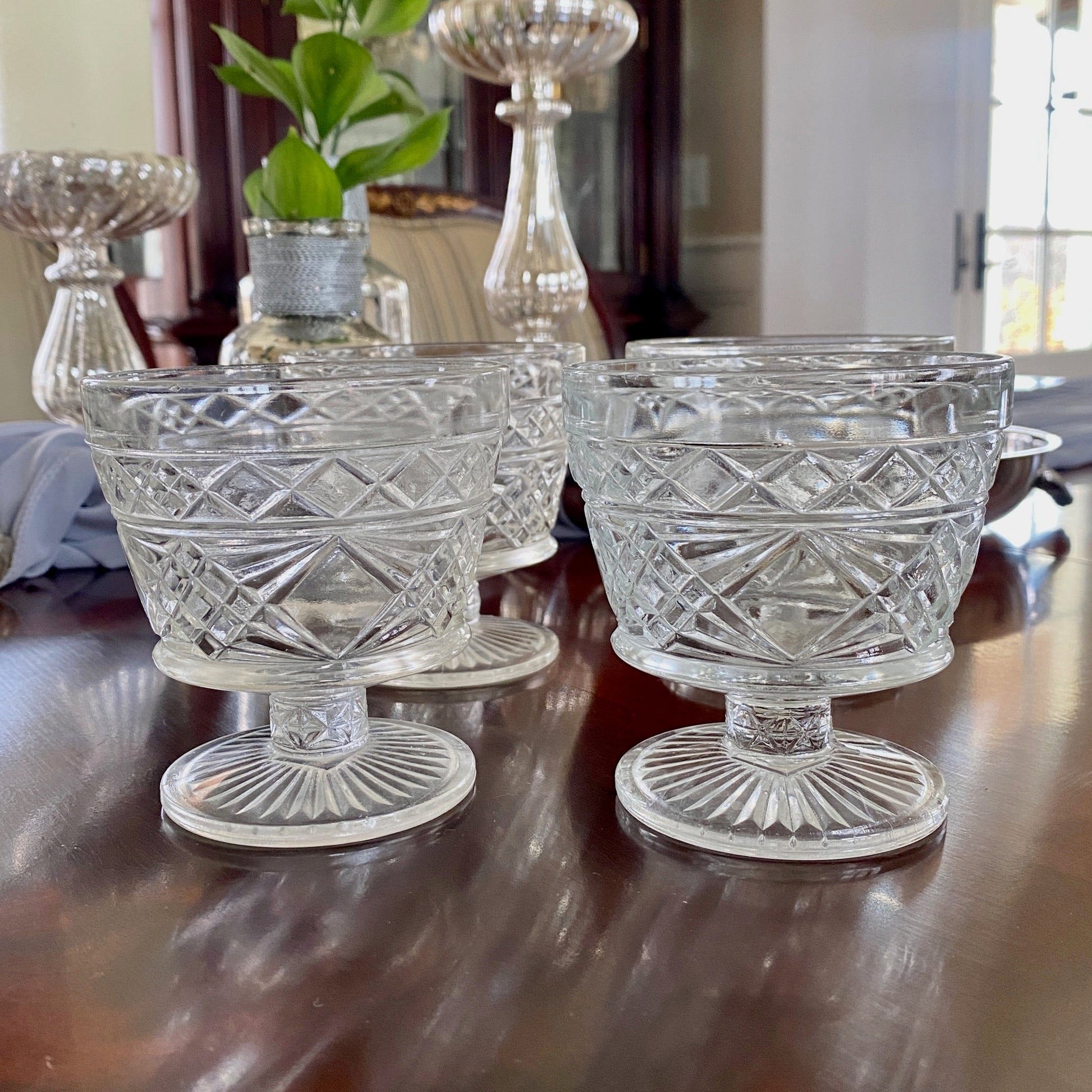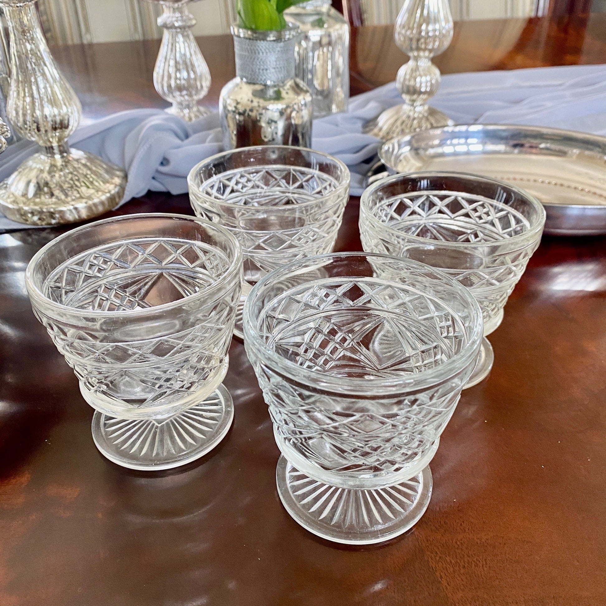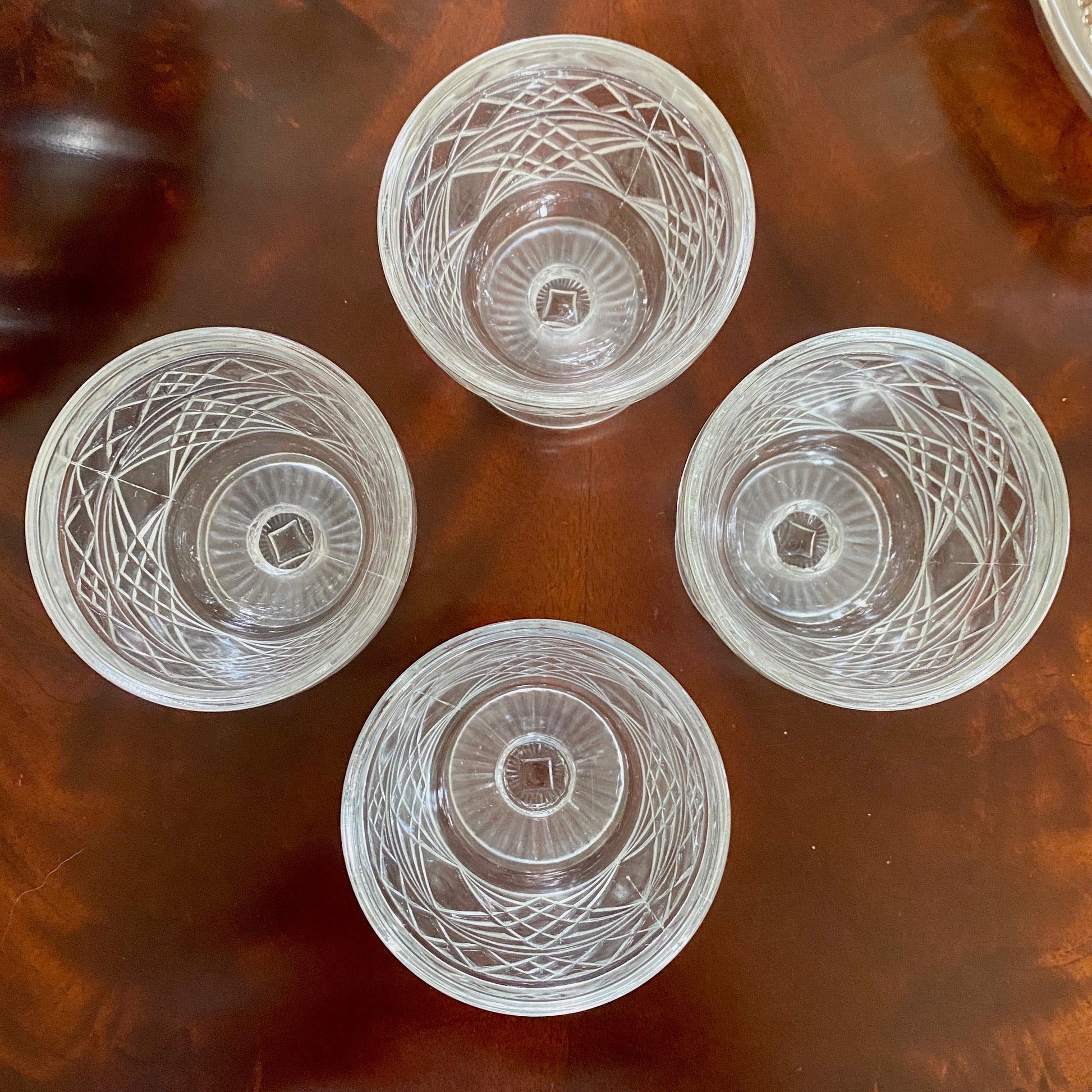 What's your flavor? This set of four of footed wine/sherbet glasses were manufactured by Hazel Atlas (this is the Gothic Pattern) makes eating dessert or drinking wine that much more enoyable. The pressed glass is decorated with a diamond and fan motif on the sides of the goblet, and on the stem. The bottom has a starburst motif.