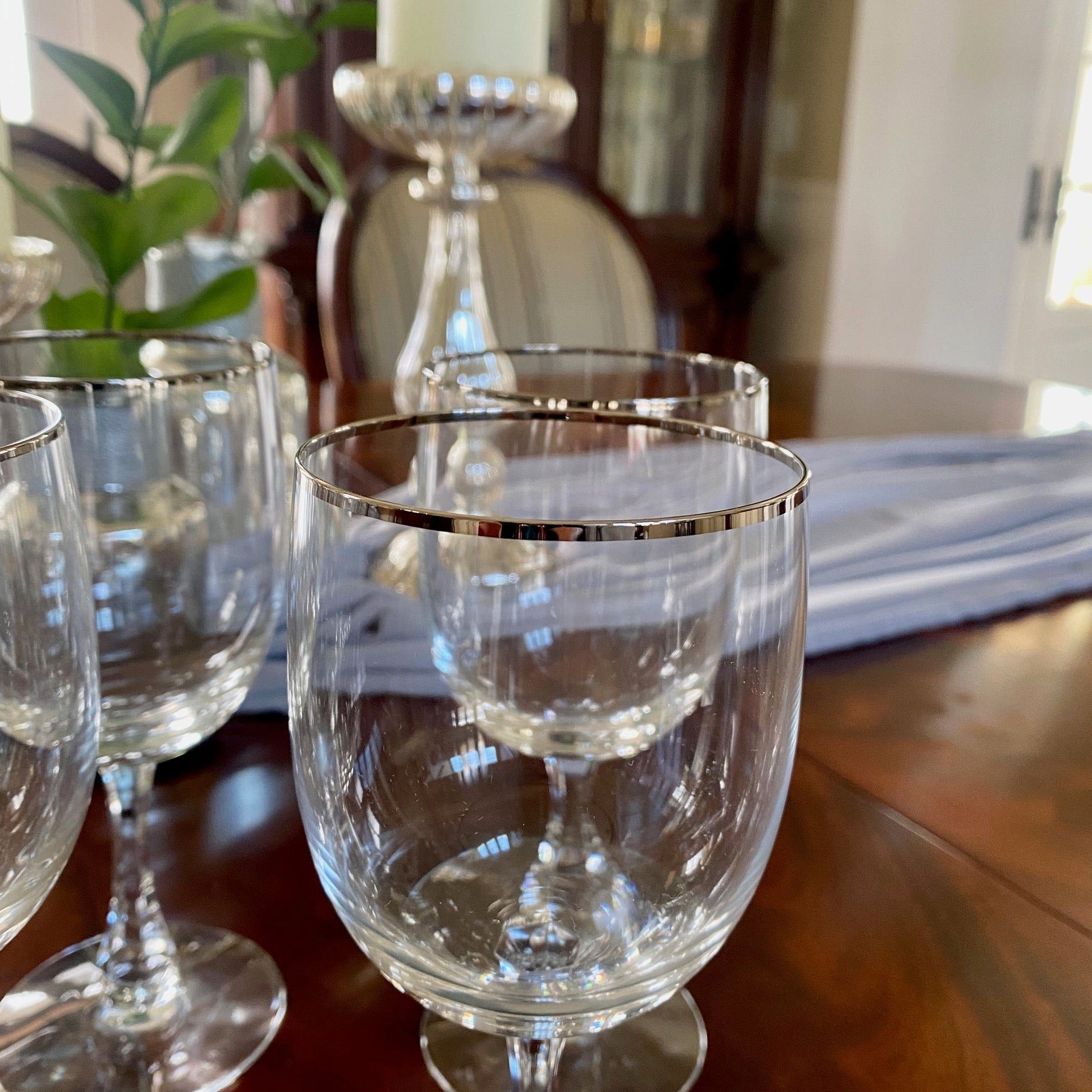 Is there a glassware brand more iconic then Fostoria? Maybe, but we're HUGE fans of them here at B Curated. This set of crystal wine glasses has a delicate silver rim- and add a marvelous sparkle to your dinner table.