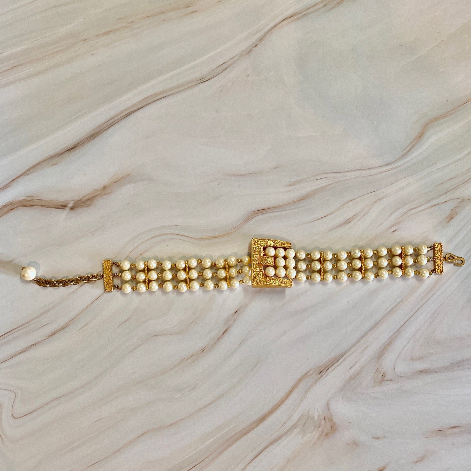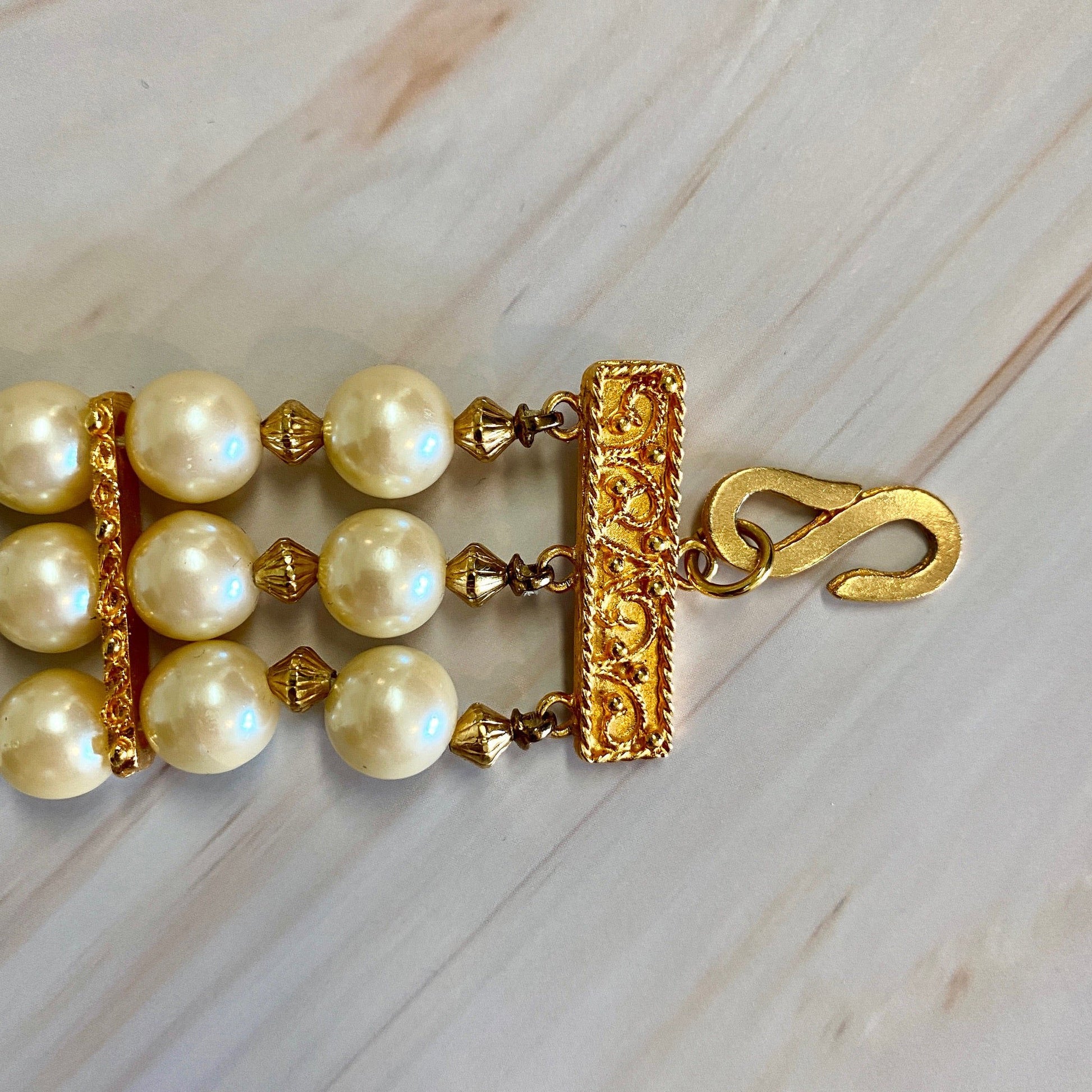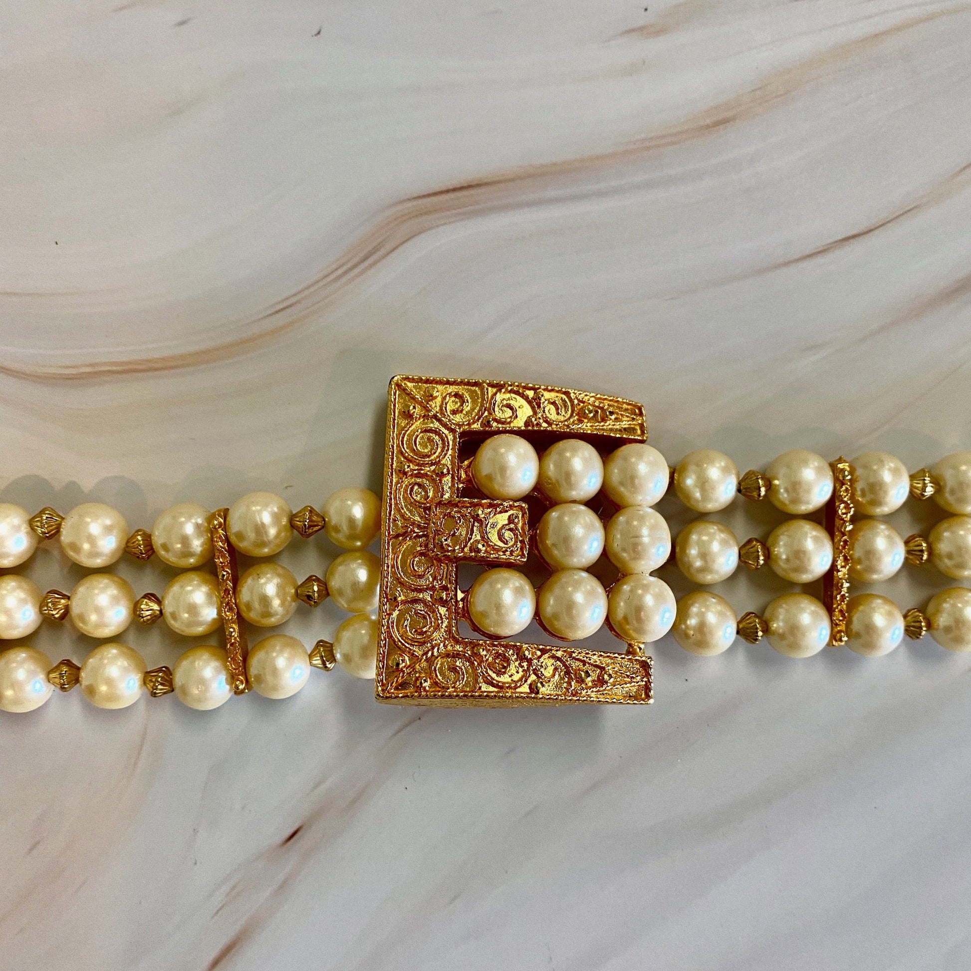 You won't find another choker like this! It almost looks like an E at first glance, but the gold buckle ties together three rows of pearls making this not only an elegant necklace, but a bad ass one as well.