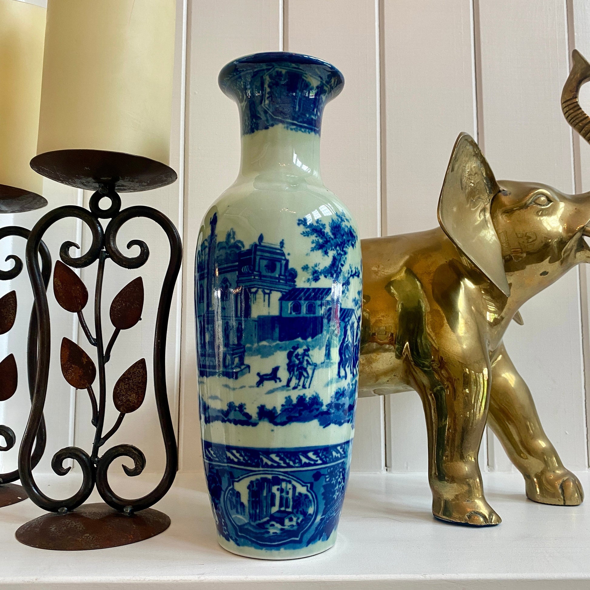 This vase is the perfect addition to any blue and white collection! It's a reproduction, depicting a town square monument, village, horses, etc. more of an off white light gray background than the traditional white. This vase was originally manufactured and imported (probably from China) in the 1990s as reproductions of English Royal Pottery. They're now considered vintage in their own right, and very collectable!
